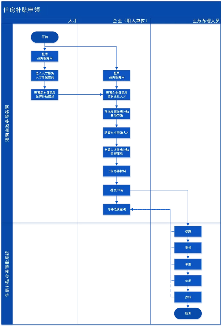 人才住房補貼申領網(wǎng)上申報操作用戶包括:人才、企業(yè)(用人單位)、業(yè)務辦理人員,操作如下圖: