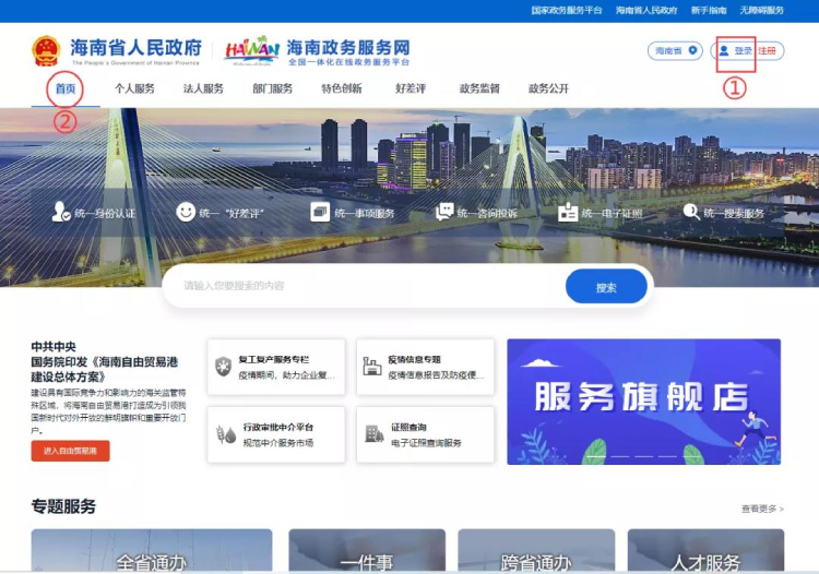 步驟1:在互聯(lián)網(wǎng)環(huán)境下,在瀏覽器地址欄輸入https://wssp.hainan.gov.cn/,回車進入政務服務網(wǎng)。