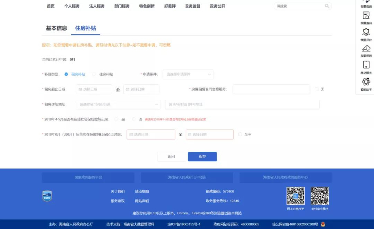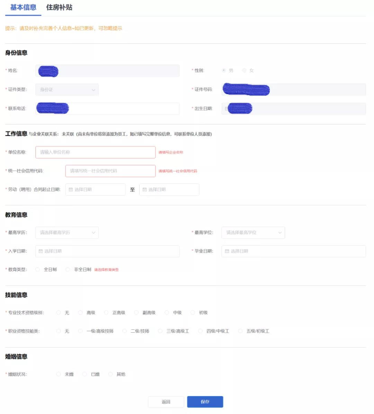 步驟2: 在人才專屬空間維護“基本信息”和“住房補貼”信息,填寫完成后點擊“保存”進行存檔,需補全信息如下圖: