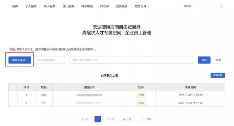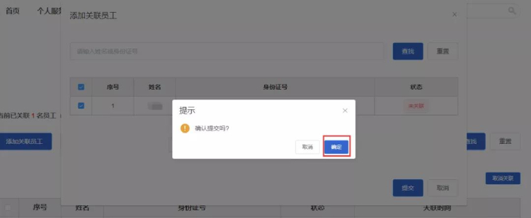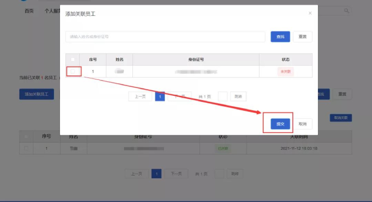 步驟4:在員工管理界面,點擊“添加關聯(lián)員工”進行員工關聯(lián),在該頁面中,可以選擇員工,如選擇不到該員工,需員工首先在“人才專屬空間”進行信息錄入,在員工管理頁面勾選員工,點擊“提交”即可,操作如下圖: