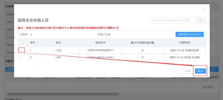 步驟2:申報頁面中,點擊“選擇申請人員”,勾選后對員工申報信息進行確認。