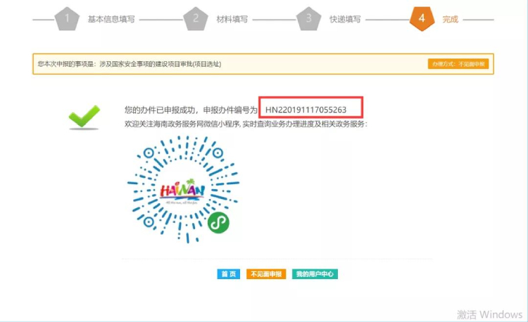 步驟7:點擊“提交申請”按鈕后,頁面跳轉(zhuǎn)到提交成功界面,生成一個辦件編號,且如果需要郵寄材料審核,則會注明郵寄材料和地址。如下圖顯示成功,申報完成?!究蛇M入”我的用戶中心->辦理中查看此申報事項的流程】