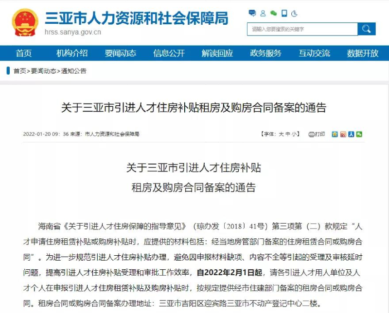 海南省《關于引進人才住房保障的指導意見》(瓊辦發(fā)〔2018〕41號)第三項第(二)款規(guī)定“人才申請住房租賃補貼或購房補貼時,應提供的材料包括:經當地房管部門備案的住房租賃合同或購房合同”。為進一步規(guī)范引進人才住房補貼辦理,避免因申報材料缺項、內容不全等引起的受理及審核延時問題,提高引進人才住房補貼受理和審批工作效率,自2022年2月1日起,請各引進人才用人單位及人才個人在申報引進人才住房租賃補貼及購房補貼時,按規(guī)定提供經市住建部門備案的租房合同或購房合同。租房合同或購房合同備案辦理地址:三亞市吉陽區(qū)迎賓路三亞市不動產登記中心二樓。